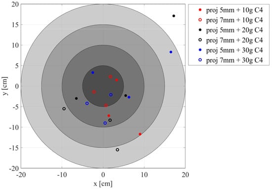 Representation of the dispersion of projectiles impacts using 5 and 7 mm projectile diameters and 10, 20, and 30 g C4 spherical explosive charges.