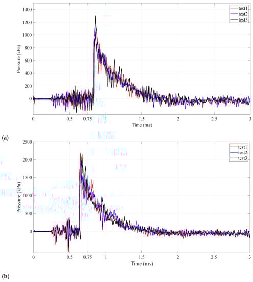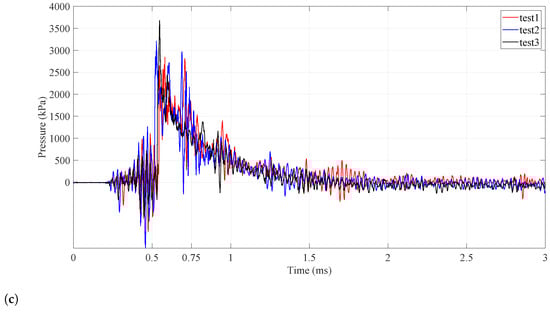 Pressure profile recorded by the high-frequency pressure sensor for the explosion of (a) 10 g, (b) 20 g, and (c) 30 g C4 charge masses.