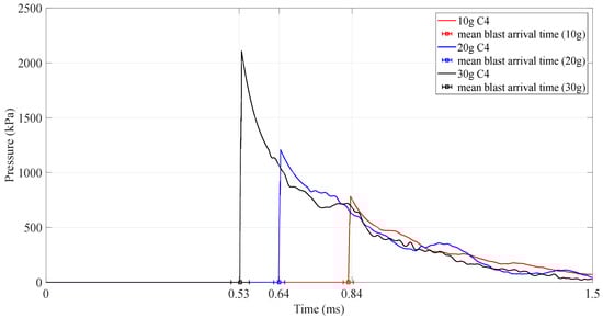 Average of the filtered signals of the pressure profiles for the 10, 20, and 30 g C4 charge masses and variability of the blast arrival time to the tube’s exit.
