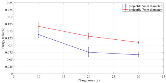 The focus is now on the projectile velocity at the exit of the tube. In order to extract the different velocities, again the in-house developed software FTS is used. The contrast and brightness parameters are defined such that the projectile is adequately isolated from its surroundings in terms of luminous intensity. The center of the projectile is then tracked and the displacement as a function of time is obtained. Consequently, the signal is derived so as to obtain the corresponding velocity of the fragment. Figure 10 shows the mean fragment velocity with standard deviation as a function of the charge mass. As expected, it can be observed that the C4 charge mass and the projectile diameter have an influence on its velocity. The 5 mm projectiles reach higher velocities than the 7 mm projectile for identical C4 charge masses. Figure 11 illustrates the percentage of energy ratio (projectile kinetic energy to charge energy) as function of charge masses. It is shown that the maximum energy ratio is obtained for the 7 mm diameter projectiles and decreases with increasing charge mass. This is not surprising knowing that the amount of transmitted energy is directly linked to the contact surface between the charge and the spheres. Moreover, an increase in the charge mass causes an increase in the charge volume. The latter causes the charge energy to increase and, consequently, a decrease in the energy ratio is obtained.