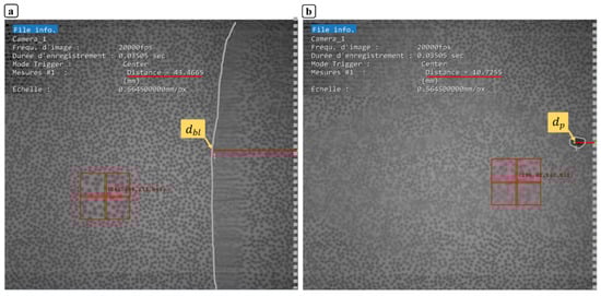 In this section, the time interval is investigated. All images obtained from the HSC are processed using the photron fastcam viewer (PFV) [31]. The reference image is chosen as the last frame recorded immediately before the appearance of the blast wave in the FOV. In a first step, the position of the blast wave front after its first appearance in the FOV is determined as shown in Figure 12a. Then, its velocity is calculated. In a second step, the number of frames between the first appearance of the blast wave front and the first appearance of the projectile in the FOV is registered. After that, the position of the projectile is determined in the image in which it first appears as shown in Figure 12b. Its velocity is obtained using the FTS as explained in Section 2.4.