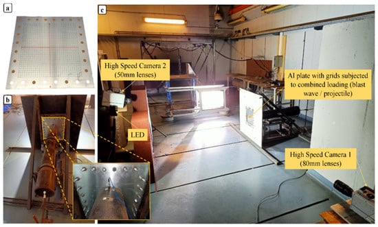 As a proof of concept, two aluminum plate specimens are placed at the exit of the EDST. They are subjected to the combined effect of blast wave and projectile impact loading. The plates with material grade EN AW-1050A-H24 and dimensions of 400 mm × 400 mm × 2 mm (Figure 13a) are fixed to the steel frame using a bolted steel clamping frame with dimensions of 400 mm × 400 mm × 3 mm (Figure 13b). A second SA5 high-speed digital camera lens is positioned on the top of the rubber brick wall as shown in Figure 13c.