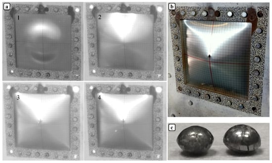 In the first stage, an out-of-plane displacement is observed in an area corresponding to the cross-section of the EDST (image 1). In a second stage, the motion propagates toward the edges of the plate. In a third stage, the plate reaches its maximum displacement. At this final stage, the projectile fully perforates the plate near its center (image 3). The position of the projectile’s impact point in the plate, as shown in Figure 14b, gives insights about its trajectory inside the tube as discussed in Section 2.2.2. After perforation, the projectile is deformed and no longer spherical. The rear half side of the projectile, which was in contact with the spherical explosive charge, has darkened due to the fire ball. The front half side is slightly flattened due to the impact of the plate. Images of the 7 mm diameter projectiles for the two tests of 10 g of C4 detonated at the entrance of the EDST are shown in Figure 14c.