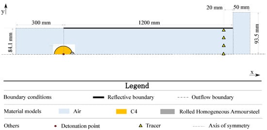 It should be highlighted that the dynamic behavior of the Aluminum plate under the combined effect of blast wave and fragment impact is out of scope for the present numerical study and will be addressed in future work. Consequently, only the EDST, the air, the explosive charge, and the projectile are modeled. The tube wall is modeled as a perfectly reflective and rigid wall. Therefore, it is simulated by constraining the flow in the Arbitrary Lagrangian Eulerian ALE mesh in the normal direction of the 1200 mm edge elements. The segments selected in the wall of the EDST were set as “no flow through normal direction” using *ALE essential boundary of the *ALE card. An “outflow” of 300 mm is considered at the entrance of the EDST where the spherical explosive charge is detonated. There were no set conditions on the segments of the free air mesh at the entrance of the tube. The total meshed area has dimensions of 1550 mm by 93.5 mm. At the tube’s exit, an outflow of 50 mm by 93.5 mm is considered. It serves to simulate the environment where the projectile enters in contact with free air. The detonation is set at time zero and located in the center of the explosive charge.
