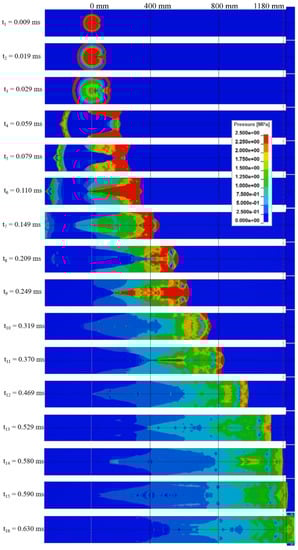 The aim of the numerical simulation explained in this section is to predict the pressure profiles, the blast arrival time, the projectile velocity, and the different phases of the projectile flight. The model will additionally serve to investigate other scenarios that were not performed experimentally. To this end, the explicit solver of the nonlinear finite element code provided by LS-DYNA is used. It takes into account both material and geometric nonlinearity. The FE model is constructed using the geometrical characteristics detailed in the experimental arrangement shown in Figure 15. Taking into account (i) the sphericity of the explosive charge and the projectile, (ii) the circular form of the cross-sectional area of the EDST, and (iii) the axi-symmetric geometry of the tube, a 2D axi-symmetric purely Eulerian model is adopted.