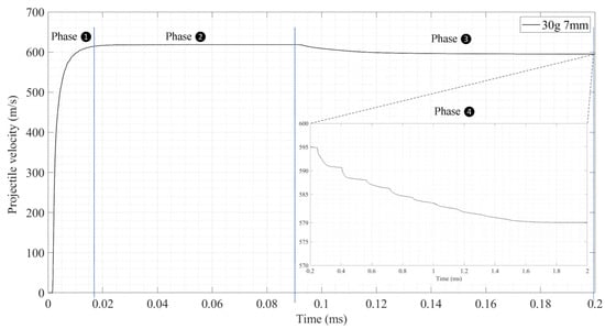 A graph of a typical projectile velocity evolution from the moment of detonation until its arrival at the tube’s exit (case of 30 g of C4 and 7 mm projectile diameter).