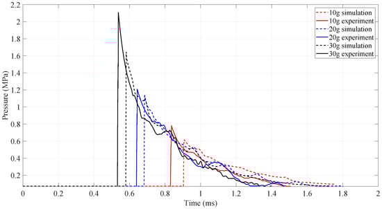 To further verify the reliability of the FE model, a comparison between the experimental and the numerical results is performed. Four variables are compared: the peak incident pressure, the blast arrival time, the projectile velocity at the tube’s exit, and . Figure 18 shows a comparison between experimental and numerical data of the TNT equivalent peak pressures and blast arrival times at 1180 mm from the center of detonation for 10, 20, and 30 g spherical explosive charges. The solid and dashed curves represent the experimental and numerical pressure–time history curves, respectively. The relative error in the peak overpressures obtained by FE model and the tests ranges between −23.11% and −4.72% while for the blast arrival time it ranges between +6.25% and +8.33%. The largest differences between the experiments and the simulations in blast arrival time and peak pressure are 60 s and 0.46 MPa, respectively. Figure 18 shows that the simulation tends to under-estimate the peak pressure and over-predict the blast arrival time. This is not surprising knowing that the physics of the simulation is not fully able to capture the irregularity of the fire ball development inside the tube. The numerical pressure–time histories show a less sharp decay during the positive phase duration when compared to the experimentally recorded pressure profiles.