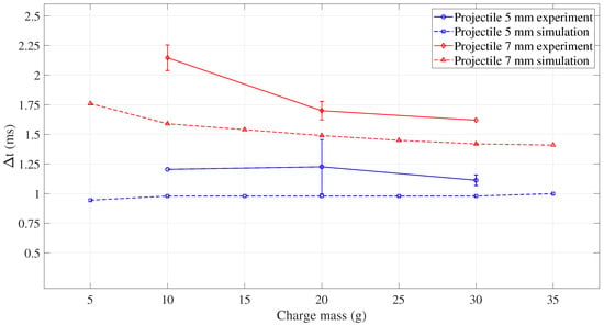 Comparison between experimental and numerical simulation results of the time interval (shown by mean and standard deviation for experiments) at the tube’s exit (1200 mm) for the different explosive charges and projectile diameters.