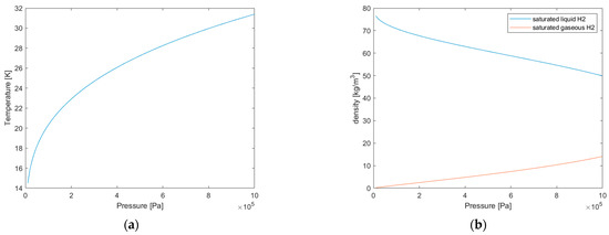For the reasons above, in this work the hydrogen is considered stored in a state close to the region 1. In such state, both liquid and gaseous phases are present (biphasic saturated state), hence, cannot fill the total internal volume of the tank. Liquid and gaseous saturated phases are at equilibrium and show the same temperature and the same pressure; therefore, they constitute a saturated liquid–gas mixture. In saturation state, the gas law is no more valid, and pressure and temperature of the mixture show a bijective relation not dependent on other variables (Figure 3). For the purposes of this work, the physical properties of the two phases were taken from [36] and used in the form of lookup tables for data interpolation.