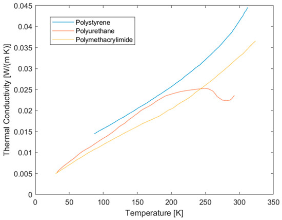 There are different ways to guarantee the insulation of the tank; the simplest is to use a thick layer of insulating material ([14,16]), such as closed cells foams; other methods use open cell foams and a mylar liner ([24,25]) or a double-walled tank, with vacuum between the walls and multi-layer insulation on each side of the vacuum jacket, in order to prevent thermal exchange by radiation ([34]). In this work, simple closed cell insulation foams are considered. The types are a polystyrene foam, a polymethacrylimide foam, and a polyurethane foam, with the characteristics summarised in Table 3. Data regarding polystyrene foam are taken from [16], whereas data about polymethacrylimide and polyurethane foams are from [25]. Thermal conductivity data about foams are taken from [16,25] and reported in Figure 4. It can be noted that, for this kind of material, the thermal conductivity strongly depends on the temperature.