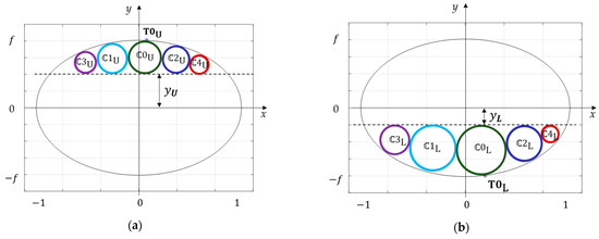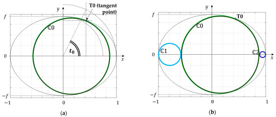Considering the circle belonging to the upper semi-plane, its centre and radius can be found by solving the system given by Equation (10), in which the first line introduces the condition of tangency of to both and as a constraint for , the second line constrains the centre to belong to the line perpendicular to the ellipse in an unknown point defined by the polar coordinate , and the third line sets the tangency of to the ellipse through an additional constraint for . Equation (10) was solved numerically using the MATLAB vpasolve function and an analogous system was solved to determine centre and radius.