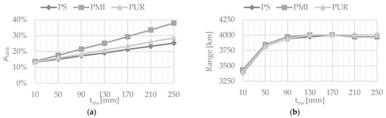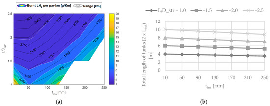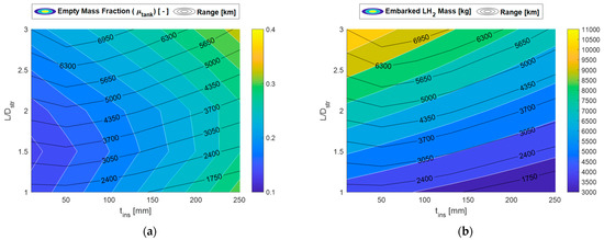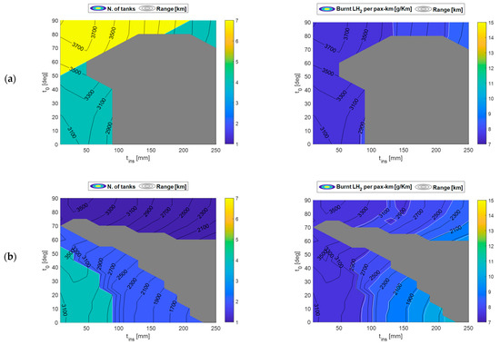 As Figure 22a shows, the maximum range is close to 3800 km which is about 65% of the reference aircraft harmonic range. Such solution, characterised by high aspect-ratio tanks ( = 2.5) with thin insulation layers (<50 mm), allows also to reach per pax-km consumption values as low as 5 g/pax/km.