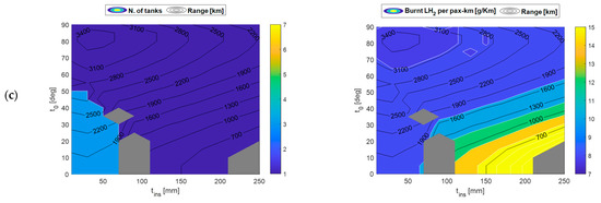 By setting = 2.5 and = 50 mm, it was observed that, compared to the case of a single group, the range increases of 6% and 10% for 2 and 3 groups of tanks were observed, respectively, whereas there is a penalisation in terms of passenger capacity (−10% and −20% approximatively). It is worth mentioning that a multiple tank solution allows to deal with other aspects not faced in the present work, such as aircraft balancing, stability, and control, with more flexibility.