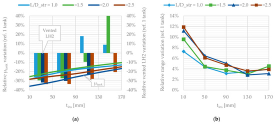 Figure 21a shows that the double tank solution exhibits lower values as decreases, and in most cases, it also reduces the vented hydrogen amount. The weight reduction, as well as the advantages introduced in structural and thermodynamic behaviour, determine an increase in flight range, which as Figure 21b shows, is more significant as is reduced.