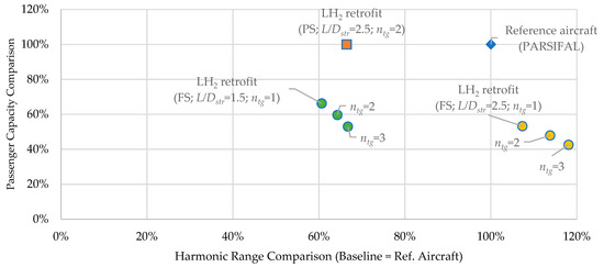 Given such preliminary results concerning the tanks’ shape and their technological aspect, the focus of the study was moved towards the possible fuselage–tank cross-section layouts. Part-section layouts, with tanks located under the cabin floor, do not affect passenger capacity and allow to achieve flight ranges up to 4000 km (about 65% of the reference aircraft harmonic range). For longer ranges, a full-section layout, provided with a catwalk corridor for safety reasons, is required. These solutions are designed to maximise the embarked in the given fuselage cross section but leads to a reduction in passenger capacity proportional to tanks’ lengths. In fact, in the range interval between 4000 and 6000 km, the number of passengers reduces from 196 to 164, against 308 of the part-section layouts. Figure 23 summarises the most relevant results in terms of transport capabilities, i.e., passenger capacity and harmonic range, compared to the reference aircraft. As shown, aiming at a high passenger capacity goal, a part-section layout is preferable, whereas the full-section layout, with the mass stored in more than one group of tanks, is a better solution to cover longer flight ranges. In addition, multiple tanks allow more flexibility in dealing with aircraft balancing, stability, and control, which are not faced in this work and should be part of future investigations. Since each solution is associated to different tanks’ lengths, any choice needs to be verified with respect to the actual availability of fuselage volume.