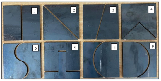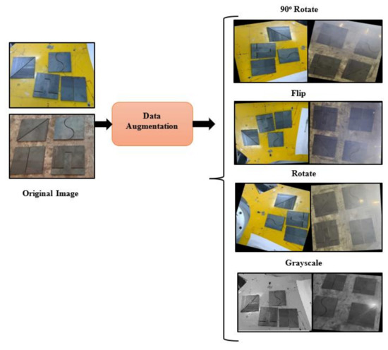 In any deep learning-based object detection, the initial step is data preparation and data cleaning. This is a very important step in any artificial intelligence technique because datasets contain duplicates and missing values which cannot be used to train deep learning models, as they may lead to larger errors in object detection [13]. The major steps in general include gathering the dataset, removing missing data and outliers, analysing the data, and finally converting it into a suitable format for the deep learning model for further processing [14]. In this work, actual weld plates were laser cut into eight different asymmetrical seam shapes to address the industrial welding process. The reason for choosing these shapes is that defected parts in industries are not symmetrical, so an attempt was made to prepare the dataset to identify the different shapes using a 2D camera with random positions at both the robot workspace and the welding table to create robust datasets. Furthermore, in order to increase the robustness of dataset and improve model training, data augmentation techniques were applied [15]. This was needed because datasets are prepared in limited conditions, but environmental conditions may vary in real-time scenarios, so different flips, rotations, saturation and grayscale were applied to the datasets. Additionally, weld fume images with arc light were also included to improve the weld seam detection. The major reason to choose a 2D camera is that they are easily available and the overall setup cost can be reduced. The main goal of this work was to train to the robot to detect and trace the weld plates anywhere in the workspace. About 2286 images were obtained which were manually labelled with the Roboflow image annotation tool. In data pre-processing, original data of 640 x 480 were resized to 416 x 416 pixels, making them suitable to train all the YOLO algorithms. The weld plate and augmentation specifications are tabulated in Table 1. The sample dataset of weld plates with different rotations is shown in Figure 2.