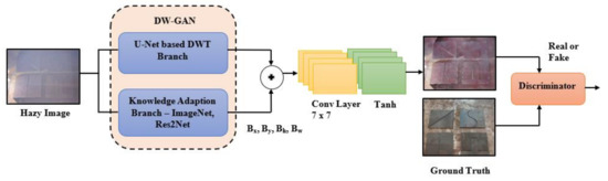 - Fu, M.; Liu, H.; Yu, Y.; Chen, J.; Wang, K. DW-GAN: A Discrete Wavelet Transform GAN for NonHomogeneous Dehazing. In Proceedings of the IEEE/CVF Conference on Computer Vision and Pattern Recognition, Nashville, TN, USA, 20–25 June 2021; pp. 203–212. [Google Scholar]