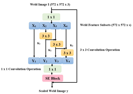 In Res2Net architecture, after 1 × 1 convolution features of Image I, is evenly split into subsets with i . To reduce the number of parameters, 3 × 3 group filters are omitted for and smaller filters are used for . The output can be written as: