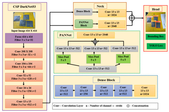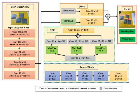 YOLOv4 DarkNet with Scaled YOLOv4 is the one of the accurate neural network models produced in recent times for single-stage object detection. Its architecture is made up of three parent blocks, namely, backbone, neck and head, as shown in Figure 5, with 334 layers. This architecture uses cross-stage partialized (CSP), in which feature maps of the base layer are partitioned into two sections and finally merged into the transition layer [34,35]. This initiates the gradient flow through different network paths, thereby reducing the amount of computation and inference speed, as well as accuracy.