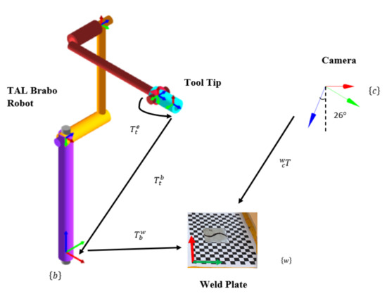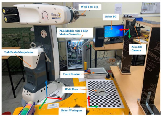 The deep learning-based welding robotic system was implemented in a five DOF TAL BRABO manipulator. This manipulator has five joints named and . The and joints are the three main joints and and are the wrist joints in this robot. Since there is no yaw motion in this robot, it is considered a five DOF robotic manipulator. The main reason to implement this work on this robot is that this robot has different kinematic and dynamic configurations, and no such experimental study has been tested on this robot. Hence, this work was carried out on a TAL BRABO robot. Secondly, there is very limited work on deep learning-based weld shape detection and tracing. The communication to TAL BRABO joints takes place through ActiveX commands written in MATLAB which communicates with the robot via a Trio motion controller. This controller is placed inside the programmable logic circuit (PLC) station from which robot is switched on. The vision system used in this paper was eye-to-hand configuration; a single 2D web camera was used, tilted at an angle of 26° to view the robot workspace where the weld plate was placed. Additionally, the camera was placed at an angle of approximately 32 degrees away from the robot base axis in order to make the problem a challenging one. Apart from the rotation and the translation of the camera into world coordinates, there was additional rotation from the axis of the robot base. This complex kinematic analysis was solved by using a neural network to convert pixel coordinates into world coordinates, as discussed in Section 4.5. The structure of the entire experimental setup is shown in Figure 8.