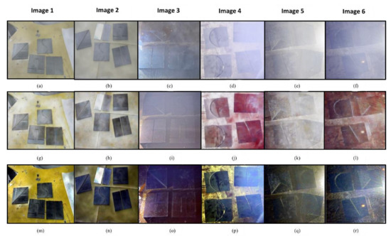 In this section, real-time experiments related to weld fume removal are discussed. The datasets used for analysing the dehazing performance included nonhomogeneous fumes present over the plates. Additionally, to make the detection robust, plates were placed in different backgrounds to prepare the datasets. In this paper, DW-GAN was used for fume removal and was trained for 3000 epochs with an image size of 1600 × 1200 pixels. The learning rate was chosen as 1e-4. The ground truth image used is shown in Figure 9a–f. The dehaze results for GAN are shown in Figure 9g–l, and for DCP they are shown in Figure 9m–r. The inference speed for DW-GAN was found to be 6.33 s, and for the DCP method it took 20.14 s for a single image.