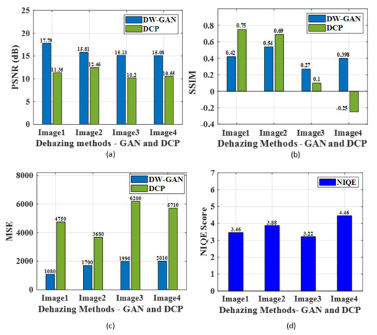Hazy images, in general, affect numerous tasks such as tracking [16], satellite remote sensing [17], and object detection [18,19] due to color distortion, blurring and other visible quality degradation. Because of unequal haze distribution, many research papers have been published on deep learning-based dehazing approaches. Thus, to address these issues, discrete wavelet transform-based GAN (DW-GAN) [20] has been implemented to remove non-homogeneous weld fumes because dense welding fumes affect the path to be traced while welding. The GAN-based technique is compared with the conventional dark channel prior (DCP) method [21].
