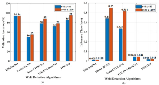 You Only Look Once (YOLO) is a popular single-stage object-detection algorithm that uses a single neural network to perform both the classification and prediction of bounding boxes. The main working of YOLO is that the images are split into square grids where each cell will predict bounding boxes of weld shapes with a confidence score for each box. YOLO finally predicts bounding boxes with coordinates, coordinates, box width , box height , and confidence . The confidence score varies between to where means no object exists in that cell and means weld shapes are present in that cell. The coordinates are the centroid of the predicted bounding box, and the width and height are fractions relative to the entire image size. The confidence is calculated based on the intersection over union (IOU), which is nothing but the area of overlap between the predicted and ground truth boxes divided by the area of the union [32,33]. In this work, different versions of YOLO algorithms such as YOLOv4 DarkNet, Scaled YOLOv4 and YOLOv5 are used, and their performances are compared.