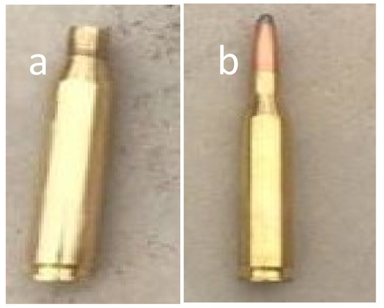 In the South African context, the Game Theft Act of 1991 grants ownership of game to persons who keep or hold game on land that is sufficiently enclosed [7]. This evolved into a system where game farmers would use defined breeding-intensive (animals maintained in small to moderate predator-controlled camps) and semi-extensive farming systems (larger environments to self-sustain the game population). Therefore, farmers have the right to trade, breed and harvest/hunt game animals as part of their game farm management strategies. Some of the strategies employed include the promotion of breeding for trophy hunting (horn size at a pre-determined age), and harvesting of meat from those animals that do not meet trophy standards [8]. The two most common methods used to kill game are (1) through rifle shooting during hunting or harvesting; and (2) aerial (helicopter) shotgun shooting during harvesting [9,10,11]. These methods utilise different calibres and bullet types. Figure 1a,b and Figure 2a,b depict examples of the different ammunition used to kill game animals during helicopter and rifle thorax shot killing.