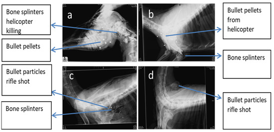 Most hunting ammunition, including pellets used in shotgun cartridges, are made of different metals such as lead (90–95%), copper, zinc, tin and other synthetic materials to make it strong and effective for hunting and killing purposes [12,13,14]. Ammunition used during killing generally tends to fragment once it hits the target so as to increase the striking force whilst also ensuring that it does not penetrate all the way through the target [15]. In addition, bone splintering, classifiable as a dangerous hazard, generally occurs when the bullet/s or pellets hit the skeletal structure of the animal or as a result of an animal falling after being hit, especially when it was hit whilst in motion [16].