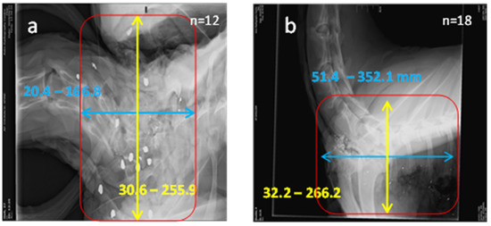 The affected surface of carcasses from the two killing methods. (a) Typical helicopter kill showing pellets’ dispersion ranges (mm) from top to bottom/vertical and sideways/horizontal of the carcasses (b) and bullet particles’ dispersion ranges (mm) from top to bottom/vertical and sideways/horizontal for a typical rifle shot kill.