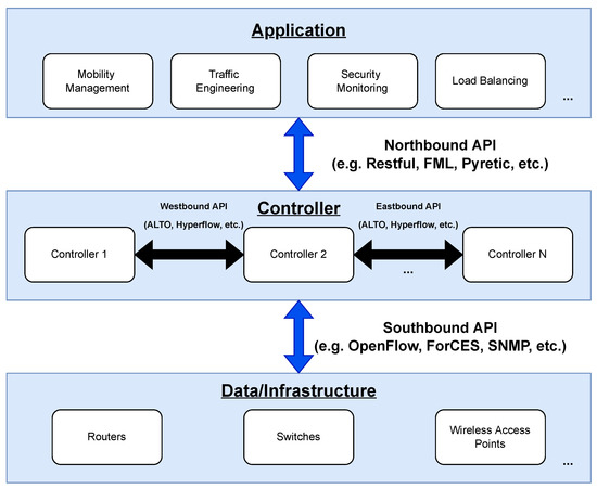 Figure 1 represents an overview example of a modern functional SDN architecture. Routers, switches, and access points comprise the infrastructure layer, as indicated in the diagram. The data plane is formed by this layer, which represents the physical network equipment in the network. Information is passed across planes of the SDN architecture through application programming interfaces (APIs). Southbound APIs like OpenFlow, ForCES, PCEP, NetConf, or IRS are used by the controller to communicate with the data plane. If there are multiple controllers, they interact via Westbound and Eastbound APIs like AlTO or Hyperflow. The application plane is the uppermost layer. The network operator can use functional applications for activities like energy efficiency, access control, mobility management, and security management at this layer. Northbound APIs such as FML, Procera, Frenetic, or RESTful are used by the application layer to communicate with the control layer. The network operator can use these APIs to relay the necessary modifications to the control layer, allowing the controller to make the appropriate adjustments in the infrastructure layer.