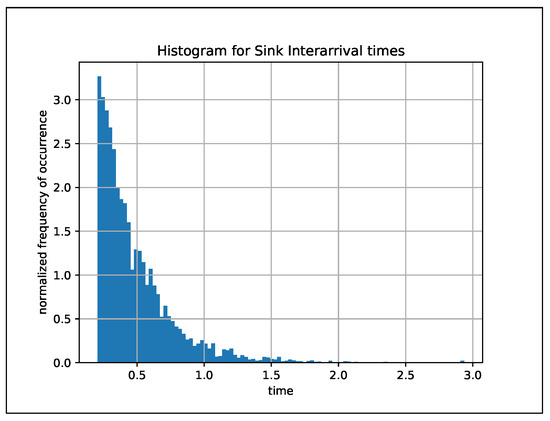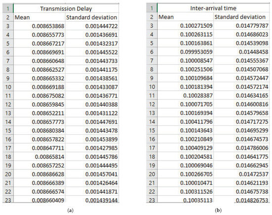 Figure 3a,b represent the statistics of the transmission delay and inter-arrival time of 21,600 samples taken for 691 measurements, respectively. The generated values for the packet transmission delay and inter-arrival time are exponentially distributed.