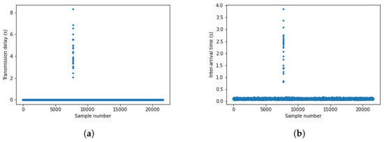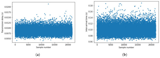 The 690th measurement for 21,600 samples with normal traffic. (a) Transmission delay for normal traffic. (b) Inter-arrival time for normal traffic.