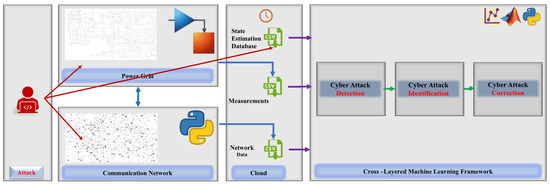 The cross-layered cyber security framework takes into account the cyber-physical domain of the concept of the smart grid. The physical domain is composed of a power grid and communication network while in the cyber domain, the collected and communicated data are analyzed. The top view of the cross-layer framework is illustrated in Figure 7. As shown in Figure 7 and reading the figure from left to right, the attacker is designed as an outside entity where the desired scenario. Data collected from the power grid and communication network are stored in files to be analyzed by the cyber-domain. The collected data then passes through three stages: detection, identification, and correction. In the detection stage, the data collected from the power grid as well as the communication network are combined and analyzed by Machine Learning techniques as shown in Figure 8. It is worth mentioning that the data stored in the “CSV” file are after the attack took place and their effects happened. For instance, for an FDI attack on measurement, the corresponding measurement in the “CSV” file named “Measurements” are altered based on the attack scenario constructed. The output of the detection stage is a flag that corresponds to the attack scenario initiated. In the identification stage, each flag will be passed to a corresponding routine for identifying the location of the attack within the network of interest. For instance, in an attack in the system database used by State Estimation (SE), the k-nearest neighbor (kNN) routine will be activated to identify which line (Edge/Arc) in the power network is being altered/attacked by the attack scenario.