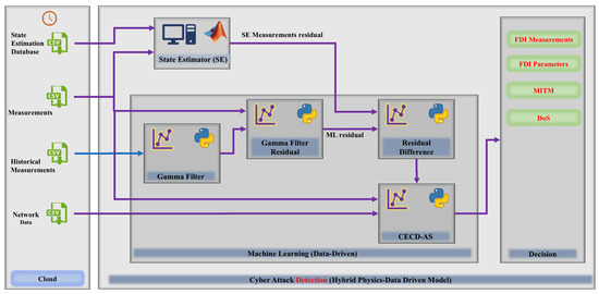 In another previous work [4], The authors created the Ensemble CorrDetwith Adaptive Statistics (ECD-AS) technique to analyze measurement data and packet contents. ECD-AS is another data-driven approach for detecting FDI attacks that takes into account the changing status of the SG. This method’s drawback is that it solely employs measurement data, limiting its capacity to identify cyberattacks focused on the SG’s communication network layer. However, the work in this research will make use of the analysis layer, which may also take into account data from the communication network that powers the SG, notably packet inter-arrival intervals, transmission delay (TD), and packet count (PC). Consideration of this form of data would broaden the model of an FDI cyberattack as well as uncover models of other types of cyberattacks that would be undetected by present methodologies in the literature. Previous work [3,14] demonstrated that ML may be utilized in the cyber domain to enhance bad data analysis by acting on the same data as the SE. This hybrid data-driven physics-model-based framework makes use of both temporal data through ML and the system’s known topology through SE. However, this approach, like the other current research investigations, solely covers FDI attacks and relies on routine measurements of power systems. As a result, it overlooks the SG’s cross-layer interdependence.