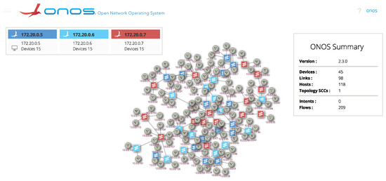 There are a variety of different controllers used in SDN literature research, such as Floodlight [24], OpenDaylight (ODL) [25], RYU [26], and Open Network Operating System (ONOS) [8]. Each has its own set of features and functions, as determined by the developers. As of its relative ease of use, multiple software applications, and network visibility in the form of a graphical user interface (GUI), we employ ONOS to construct a controller cluster to manage our SDN network to achieve our distributed three controller architecture. A detailed overview of our implementation of ONOS can be found in Section 4.