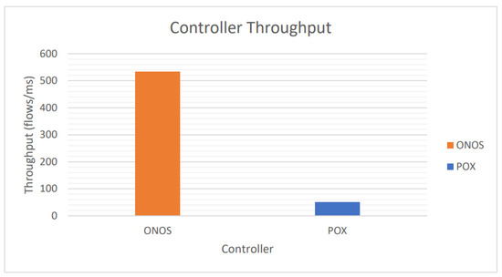 CBench [36], a tool for benchmarking Openflow controllers, is used to test the SDN architecture. We can calculate the maximum throughput, or how much data was sent from a source at any particular moment, using CBench. CBench emulates the N amount of OpenFlow switches set by the researchers and connects it to the controller. Then, it emulates traffic and calculates and records the throughput. In the cluster, we test each ONOS controller individually to establish the maximum throughput for 45 open vswitches (15 switches for each controller). We ran this test again for the single POX controller for all 45 open vswitches at once and documented the results. Figure 11 shows the results of our controller benchmarking test. The ONOS cluster had an average throughput of 533.121 flows/ms, whereas the POX controller had a flow rate of 50.267 flows/ms, which is more than a tenfold improvement. Our tests revealed that a distributed controller design not only removes a single point of failure but also improves network and resource management throughput. By spreading the network workload, the ONOS cluster can endure the rigors of the smart grid better than a single controller.