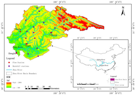 Location, digital elevation model (DEM), and ground observations in the Zhou River Basin (the Zhou River is a first-class tributary of the Jialing River).