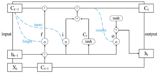 The chain structure of the LSTM contains three main gates, which are shown in Figure 2: (1) the forget gate , which determines how much of the cell state from the previous moment is retained in the current cell state ; (2) the input gate , which determines how much of the input to the network is saved to the cell state at the current moment; and (3) the output gate , which controls the unit state and how many inputs it has to the current output value [44].