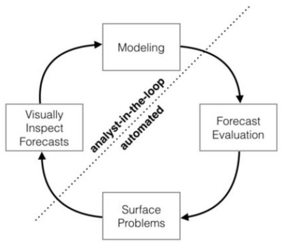 The Prophet model is a decomposable time series forecasting model open-sourced by Facebook [45,46]. The model is a whole-loop structure divided into a manual manipulation part and an automated part, which integrates background knowledge of specific problems and statistical analysis [46]. Analysts can check predictions and adjust models based on feedback and realistic scenarios. This combination makes the Prophet model more accurate and rapid, more automatic, and parameters are easier to adjust than the traditional time series prediction model [47]. The principle of the model is shown in Figure 3.