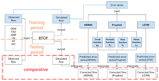Firstly, the BTOP model simulates runoff in the training period. The parameters are automatically optimized and input into the BTOP model to simulate runoff during the testing period. Then, the simulated runoff flow is compared with the observed flow to obtain the error series of the training period, which is used as the input value of the time series model. After normalized pre-processing of the error series, the Prophet, LSTM, and ARIMA models are used to predict the time series of the training period error sequence, and the predicted error series of the testing period is obtained. Finally, the predicted error series is used to correct the simulated flow to obtain the corrected flow. Five indicators are used to compare the corrected flow and the original simulated flow: the NSE index, Pearson correlation coefficient R, mean absolute error (MAE), root mean square error (RMSE), and mean absolute percentage error (MAPE) (Figure 4).