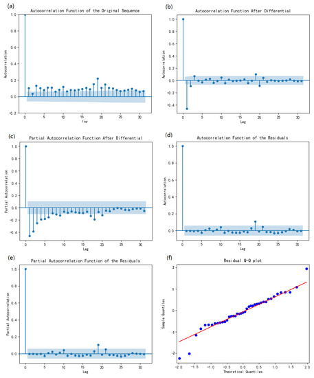 By observing the ACF (autocorrelation function) and PACF (partial autocorrelation function) plots after differencing (Figure 5b,c), we can see that both ACF and PACF show smearing, the PACF cut-off is at lag 6, and ACF decay tends to zero after lag 1, so it is ARMA (6, 1) [53]. Finally, ARIMA (6, 1, 1) can be determined by combining first-order differences. Next, the error series of the testing period was simulated, the predicted results were fitted to the true values, and the residual series were analyzed (Figure 5d–f). The residual series in the figure is within the confidence interval above and below the mean 0, and the residual series passes the white noise test [54]. The result of the D-W test [55] on the residuals is 2.002, which is close to 2, indicates that there is no autocorrelation in the residuals predicted by the model, and the sample quantile distribution in the residual Q-Q plot is similar to the theoretical quantile distribution. All of this shows that the fitted model has good prediction.