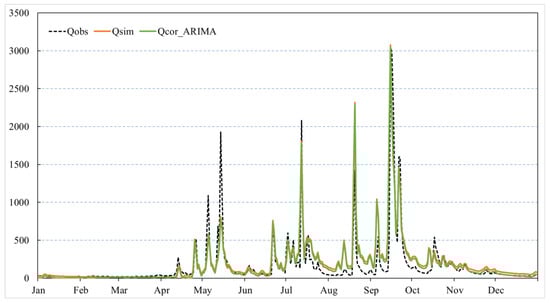 Figure 6 is the runoff simulation diagram obtained using the ARIMA model to correct the simulated runoff from the BTOP model. It can be seen that the modified curve of the ARIMA model effectively reduces a certain amount of runoff in the low flow periods to make it closer to the observed flow, which reduces the error to a certain extent and improves the simulation accuracy of the model. However, the modification of the ARIMA model in both the low-flow and high-flow periods is used to reduce runoff based on the original BTOP simulation trend. This is because the ARIMA model is, after all, only a model with statistical significance, the simulation of the hydrological process lacks physical cause analysis, and the simulation of the error series is only based on the information input before this period; thus, it may be difficult to deal with the turning point of the maximum value in the period of high flow. Therefore, measures should be taken in the practical application [56]. In general, the ARIMA model relies on the time-series dependence of forecast errors so that the errors will accumulate rapidly in the extrapolation process, and it is not suitable for larger basins or situations requiring longer forecasting periods [57].