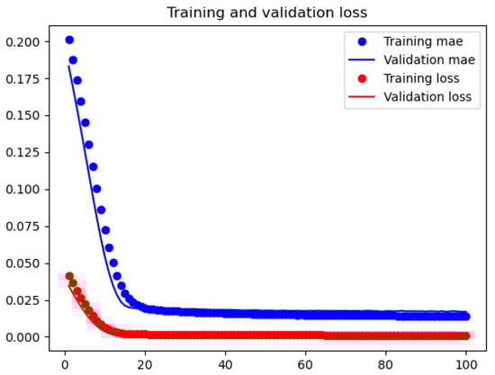 To improve the model accuracy, precipitation series were added for multivariate prediction in addition to the error series. The training dataset uses the simulated BTOP values from 1982 to 1984, and the 1985 data is the testing dataset. The input data are first normalized to make each feature variable contribute equally to the results, speed up the model iteration and improve the model accuracy. After many rounds of debugging, the model training parameters are: leaning_rate = 0.001, units = 20, batch_size = 5, epochs = 100. Due to the small amount of training data and the number of training sessions, overfitting occurs in the parameter debugging, so the regularization method is introduced. Figure 7 shows the loss of the training process. We can see that the MAE and loss decrease significantly in both the training and testing sets, and level off after 80 iterations, indicating that the LSTM model fits well.