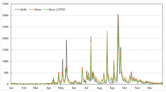 Figure 8 is the runoff simulation diagram obtained by using the LSTM model to correct the BTOP model. It can be seen that the corrected green curve trend of the LSTM is more consistent with the observed flow, and the error is reduced in most of the low-flow seasons. However, runoff has reduced slightly at the same maximum point rather than increased, mainly because the LSTM during practice is the trend of the error sequence in learning, without considering the error that comes from different scenarios. That is, there is no difference when handling the high-flow and low-flow season of the error sequence. As a result, the correction effect is not as good as the Prophet model [58,59]. In fact, different forecast scenarios and their corresponding forecast error distributions are important information for predicting the magnitude of forecast errors in future periods [60,61].