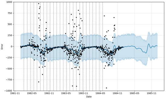 This function represents the residual fluctuation, and there is no specific formula for calculation. The mcmc_samples parameter was used to select the probability estimation mode. If the parameter is n (n > 0), the model will make a full Bayesian inference with n Markov sampling samples. In this paper, maximum posterior probability estimation (MAP) is directly adopted and the parameter is set to 0. This study uses the Python language under the Windows system to run the Prophet model, so the stan_backend parameter was set to cmdstanpy.