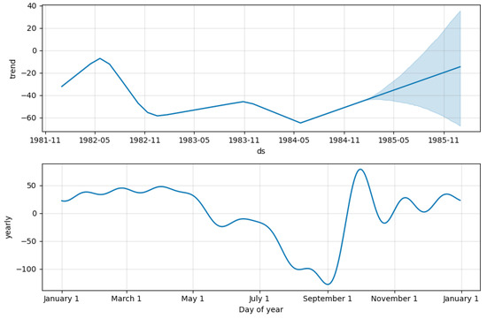The time series contains seasonal trends in various types of cycles, such as days, weeks, months and years [49]. For these irregular periodic variations, fitting these variations effectively has a significant effect on the accuracy of the model predictions. Therefore, the Prophet model approximates this cyclical property with a Fourier series [50].