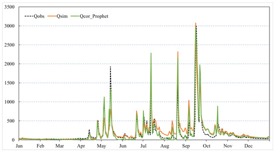 Figure 11 is the runoff simulation diagram obtained using the Prophet model to correct the BTOP model. From the curves of the observed and simulated values therein, it can be seen from the observed and simulated curves that the BTOP model has achieved a good daily runoff simulation effect in the study area, the base simulated flow is close to the observed flow, and the flood peak simulation time is accurate [62]. Careful analysis of the error sources shows that the simulated flow of BTOP is generally slightly higher than the observed flow during the low-flow periods, while the simulated flood peak flow is much smaller than the observed flow in high-flow periods, which is the result of the transmission of BTOP model operation error from upstream to downstream [61]. Next, by looking at the Prophet correction curve, it can be found that the corrected runoff curve is closer to the observed flow in the low-flow periods. It also has a good correction effect in high-flow periods, but is not as significant as in low-flow periods. This indicates that the revision of the Prophet model is mainly reflected in reducing runoff through and in low-flow periods, and increasing runoff through in the maximum high-flow periods. However, for the few events where the simulated BTOP values are too large during the high-flow periods, the Prophet model only slightly reduces the runoff and is not effectively corrected (20 August). This is also the focus of further improvement of the model.