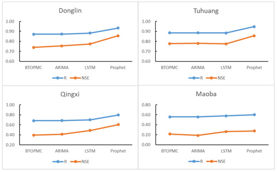A comparison of the R and NSE of the three time series models and the original BTOP model is shown in Figure 12. We can see that the R and NSE of the runoff series were improved at all four stations, among which the Prophet model has the most significant improvement effect (NSE increased by an average of 30% and R increased by an average of 10%). Although the improvement effect of the LSTM and ARIMA models is not particularly obvious, mainly because they only predict the terminal error without considering the actual situation and runoff pattern characteristics, it also proves that it is effective to use the time series model to conduct runoff simulation correction for BTOP.