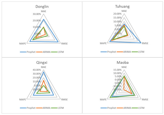 - At Maoba station, where the BTOP simulation is the least effective, MAE, RMSE and MAPE decreased by 5.15%, 2.61% and 7.05% after Prophet modification. At this time, the modified effect of the Prophet model began to decline, and the error reduction rate after the modification of LSTM and ARIMA models was close to that of the Prophet.